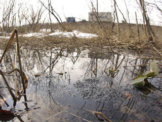 さて、実際の作業であるが、湿原の上に積もった雪が凹んでいる場所を探し、
